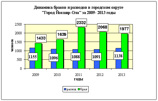 По данным Территориального органа Федеральной службы государственной статистики по Республике Марий Эл численность постоянного населения городского округа город «Йошкар-Ола» по состоянию на 1 января 2013 года составила 267 746 человек. За период январь-декабрь 2013г. в городском округе «Город Йошкар-Ола» зарегистрирован естественный прирост населения. Его величина составила 528 человек (за январь- декабрь 2012 года – 548 человек). Демографическая ситуация в округе характеризовалась увеличением и числа родившихся и числа умерших. В городском округе «Город Йошкар-Ола» за 2013 год родилось 3725 детей, что на 56 детей больше, чем за аналогичный период 2012 года. В январе-декабре 2013 года умерло 3197 человек (за 2012г. –3121). В январе – декабре 2013г. в городском округе «Город Йошкар-Ола» было зарегистрировано 1977 браков (36,1% от общего числа браков, заключенных в республике) и 1138 разводов (38,7% от общего числа разводов). На 100 браков приходится 58 разводов (за январь-декабрь 2012г. - 53 развода). Число зарегистрированных браков в 2013 году уменьшилось по сравнению с 2012 годом на 4,4%, а количество зарегистрированных разводов увеличилось на 4,3 % . В январе-ноябре 2013г. в городской округ «Город Йошкар-Ола» прибыло 8670 человек, выбыло 6119 человек. Миграционный прирост составил 2551 человек против 3490 человек в январе-ноябре 2012г.
